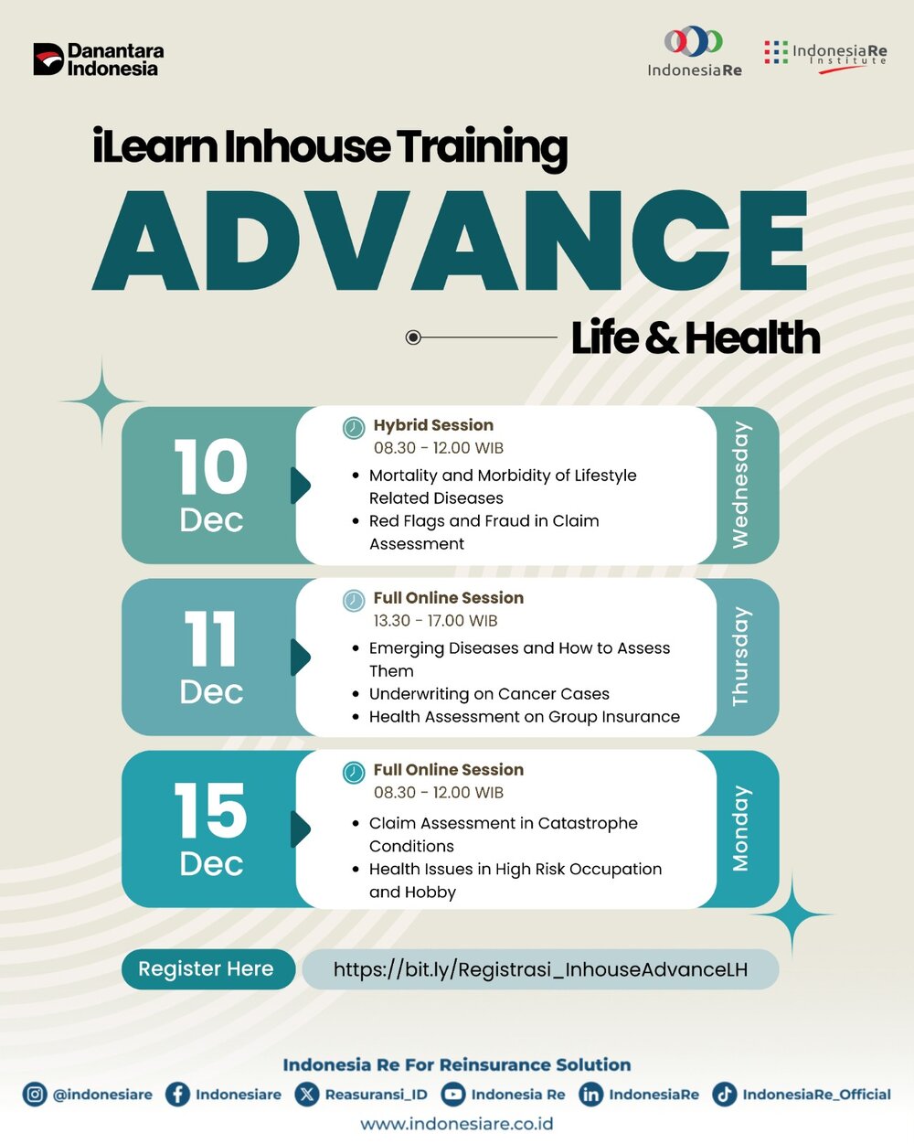 iLearn Program Inhouse Training – Advance L&H 2025 diperuntukkan bagi middle-senior level Underwriter, Claim Analyst, Actuary, dan personel lainnya di Perusahaan Asuransi Jiwa yang menjadi mitra bisnis Indonesia Re. Berdasarkan hasil training need analysis (TNA) yang dilakukan oleh Indonesia Re Institute, program pelatihan tingkat advance ini telah menjadi salah satu program yang ceding harapkan dapat difasilitasi oleh Indonesia Re pada tahun 2025. Selain itu, diharapkan, Inhouse Training – Advance L&H 2025 ini dapat menjadi sarana diskusi interaktif sekaligus engagement event antara Indonesia Re dengan para mitra bisnis dari Perusahaan Asuransi Jiwa.