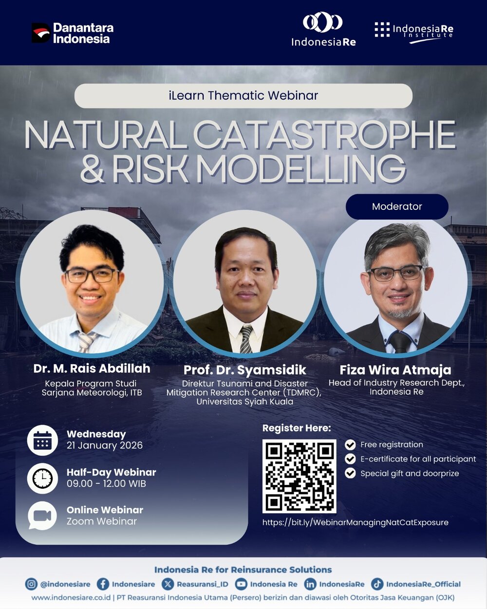 Di tengah dinamika tersebut, pendekatan tradisional dalam mengukur dan memitigasi risiko kebencanaan tidak lagi memadai. Diperlukan catastrophe risk modelling yang lebih komprehensif: berbasis probabilistik, integrasi data spasial dan hazard, pemetaan eksposur, serta proyeksi kerugian menggunakan skenario realistis. Selain itu, inovasi solusi asuransi — termasuk reasuransi, parametric insurance, dan pooling — menjadi kunci dalam menciptakan ketahanan finansial jangka panjang. Pendekatan tersebut menjadi latar belakang dari penyelenggaraan iLearn Thematic Webinar yang bertajuk “Managing NatCat Exposure: Risk Modelling and Insurance Solutions for a Resilient Future”. Webinar ini hadir untuk menjembatani pemahaman antara ilmu kebencanaan, teknologi pemodelan, strategi pembiayaan risiko kebencanaan, serta menjadi forum diskusi interaktif dan kolaboratif antara pemangku kepentingan terkait bagaimana industri perasuransian mampu berperan dalam strategi ketahanan bencana nasional.