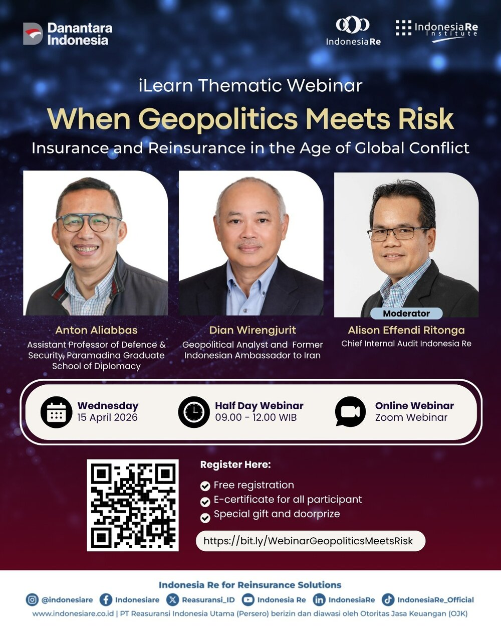 Kegiatan knowledge sharing ini akan menghadirkan 2 (dua) orang narasumber ahli sebagai pengamat geopolitik dan 1 (satu) orang moderator sebagai fasilitator. Diharapkan, melalui iLearn Thematic Webinar ini, peserta akan memperoleh insight serta perspektif dari berbagai perspektif multidisiplin mengenai keterkaitan antara dinamika geopolitik global dan implikasinya terhadap industri asuransi dan reasuransi.